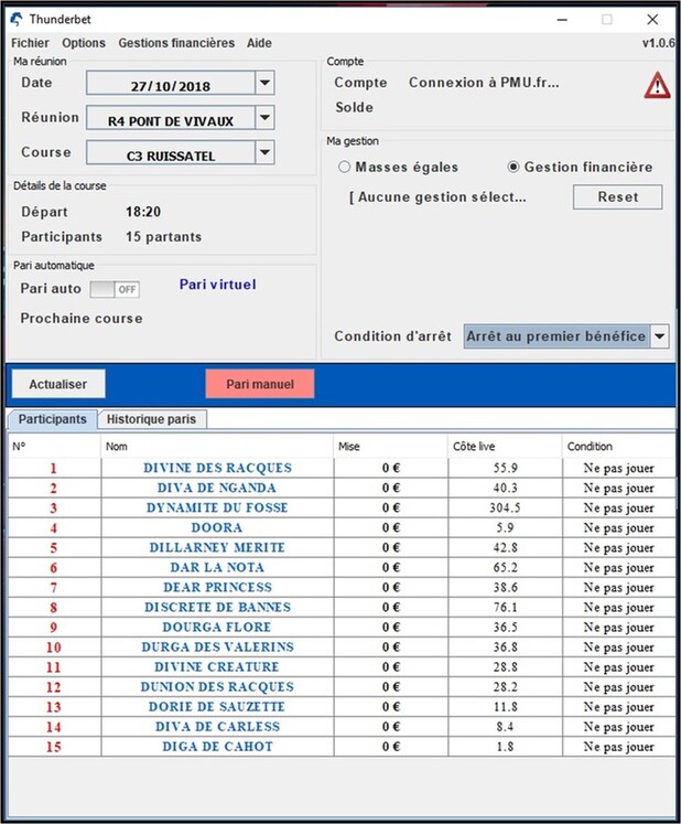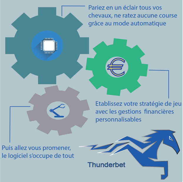 Thunderbet : un logiciel de paris hippiques professionnel, entièrement automatisé pour le jeu simple, avec 4 gestions financières personnalisables : la gestion progressive, la gestion paramétrable, la gestion éclair et la gestion éclair 1-4. Profitez aussi de l'option Report intégrée au logiciel. Elle est offerte avec Thunderbet.