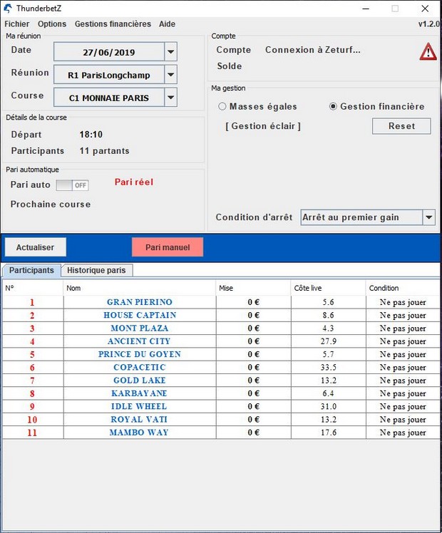 Note : vous pouvez aussi demander l'arrêt au 1er cheval à l'arrivée ou l'arrêt au 1er bénéfice rencontré dans la journée si vous jouez à masse égale (toujours la même mise) ou avec une des gestions financières.